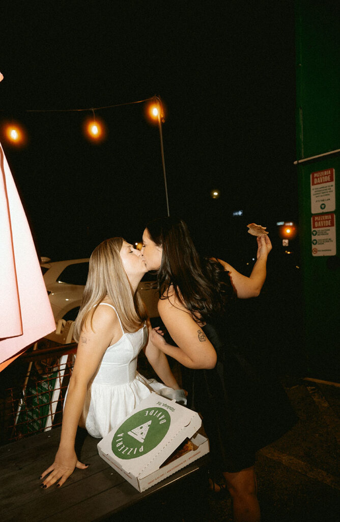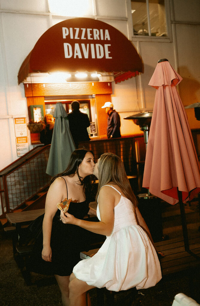 We stopped at Pizzeria Davide, which was the perfect place for fun, documentary-style shots: eating a slice, laughing over greasy fingers, leaning into each other like the city was theirs.