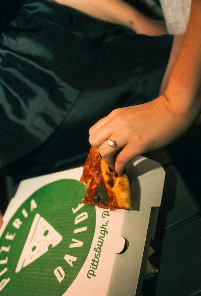 Strip District pizza moment – “Fun candid photo of couple eating pizza at Pizzeria Davide in the Strip District.”